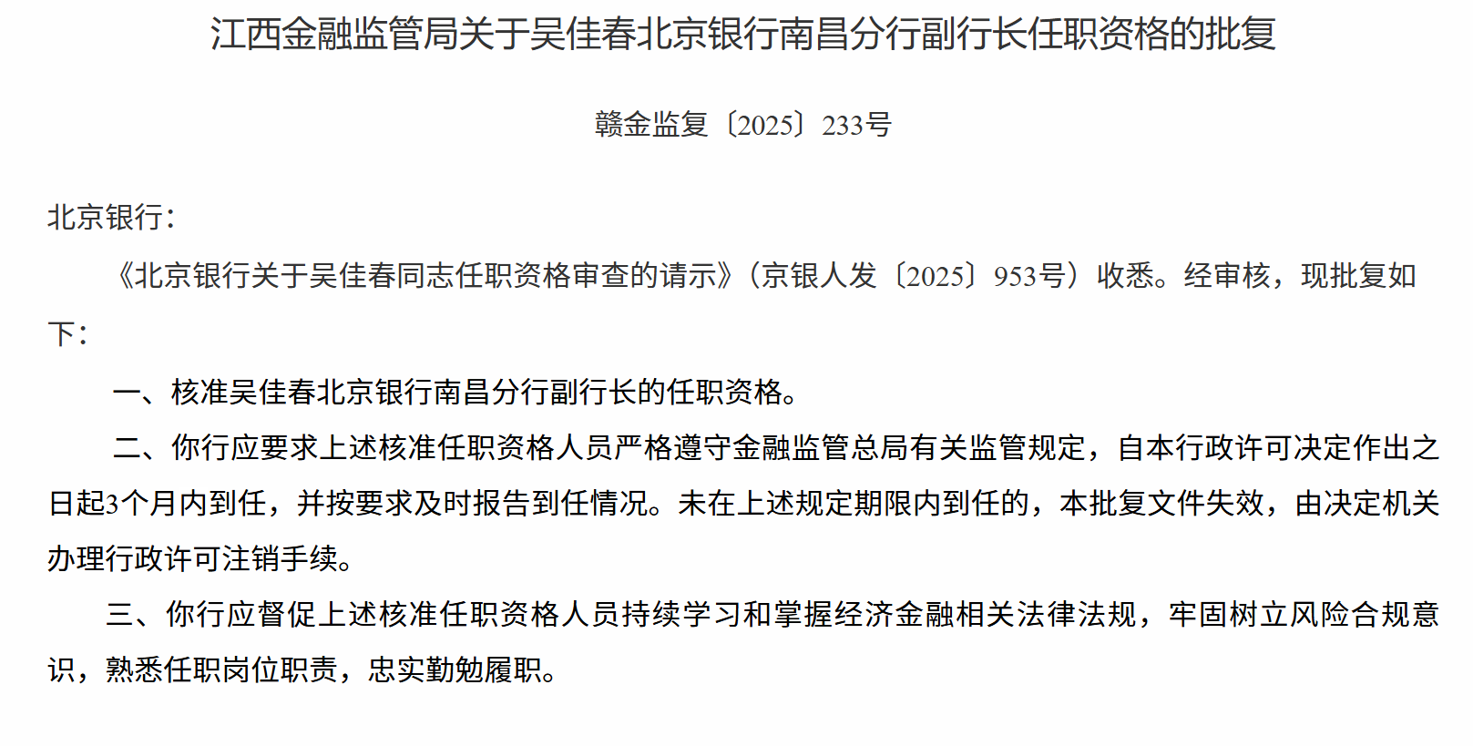 12月12日,江西金融监管局发布关于吴佳春北京银行南昌分行副行长任职资格的批复优速配资,核准吴佳春北京银行南昌分行副行长的任职资格。