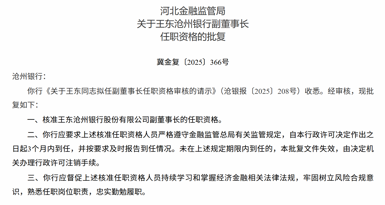 12月12日中证策略,河北金融监管局关于王东沧州银行副董事长任职资格的批复,核准王东沧州银行股份有限公司副董事长的任职资格。
