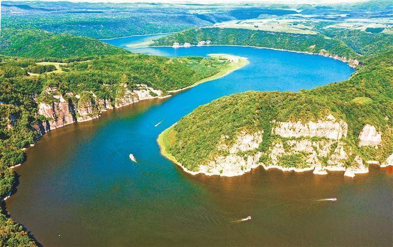 9月9日,游船行驶在吉林省白山市靖宇县松花江生态旅游风景区。该景区依托松花江流域11.5公里航道水域沿岸,打造松花江水上旅游大通道。