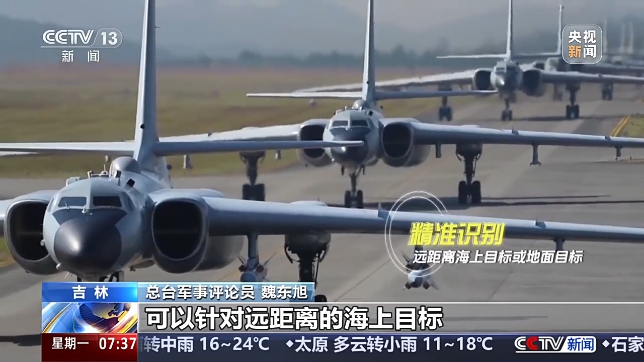 总台军事评论员 魏东旭:在长春空军开放活动的过程当中,看轰-6应该是有顺序的,为什么?因为在我们服役时间比较长的这种飞机的展示区,其实也有一架轰-6,我们可以进行一下对比。当时的轰-6它机身的前部是一个透明的座舱,因为当时主要是利用一些这种瞄准的设备,要针对地面的目标进行锁定,才能够进行轰炸。但是现在我们再看一下轰-6K这个情况就完全不一样了,它变成了大型的机载雷达,我们可以注意到轰-6K最大的优势就是“眼神”好了,可以针对远距离的海上目标或者是地面目标进行精准识别,然后使用导弹针对目标进行打击。